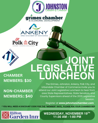The Grimes, Johnston, Ankeny, Polk City and Urbandale Chamber of Commerce invite you to attend our Joint Legislative Luncheon to hear from State Representatives, State Senators, and County Supervisors ahead of the 2026 Legislative Session.